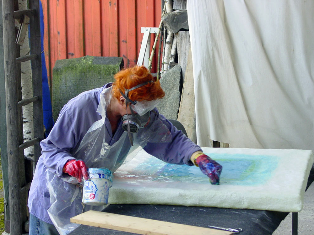 “When Kontrec began using synthetic resin with pigments for her work in 2004, it seemed to be a real cut, almost a break in her work. Since that time, she has been focusing on color as a new theme in her work. However, this has not meant a shift from sculpture to painting, because she does not use color for merely painting flat surfaces. For her is color pure energy. In her picture-objects, the sculptural themes of space, volume, material and texture continue to play an important role.”